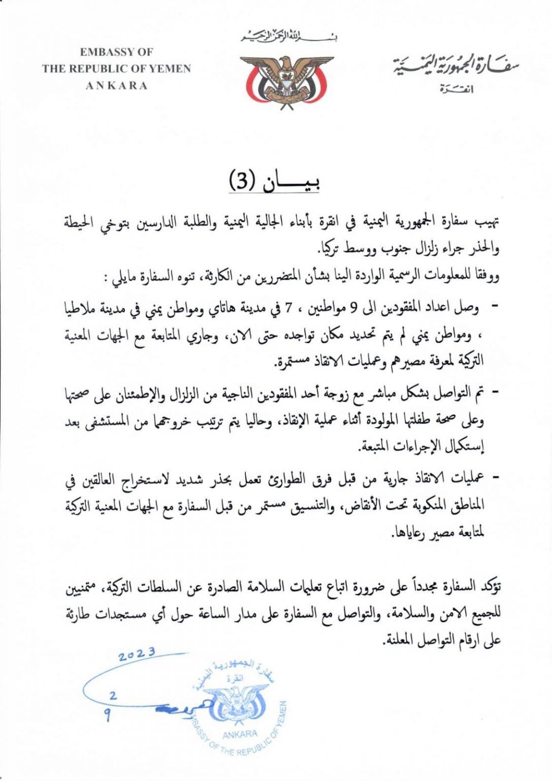 ووفقا للمعلومات الرسمية الواردة الينا بشأن المتضررين من الكارثة، تنوه السفارة مايلي : وصل اعداد المفقودين الى 9 مواطنين ، 7 في مدينة هاتاي ومواطن يمني في مدينة ملاطيا ، ومواطن يمني لم يتم تحديد مكان تواجده حتى الآن، وجاري المتابعة . الجهات المعنية التركية لمعرفة مصيرهم وعمليات الانقاذ مستمرة.